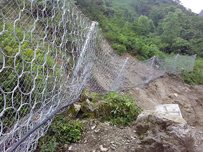 被动防护网由钢丝绳网或环形网(需拦截小块落石时附加一层铁丝格栅),固定系统(锚杆、拦锚绳、基座和支撑绳)、减压环和钢柱四个主要部分构成。钢柱和钢丝绳网连接组合构成一个整体,对所防护的区域形成面防护,从而阻止崩塌岩石土体的下坠,起到边坡防护作用。