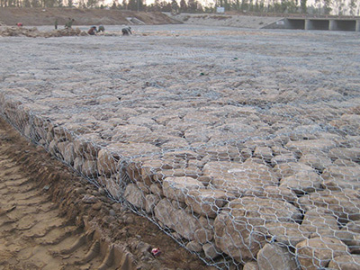 雷诺护垫也叫石笼护垫,格宾护垫,是指由机编双绞合六边形金属网面构成的厚度远小于长度和宽度的垫形工程构件。雷诺护垫中装入块石等填充料后连接成一体,成为主要用于水利堤防、岸坡、海漫等的防冲刷结构,具有柔性、对地基适应性的优点。